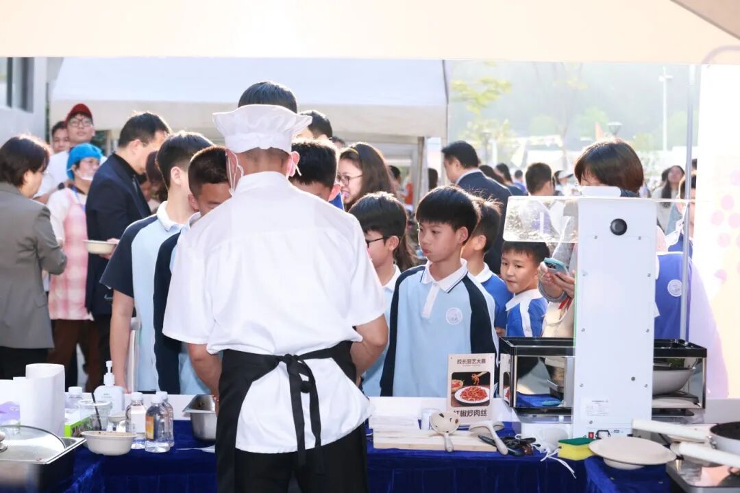 此外,最熱鬧的展臺要數“校長廚房”了。手起刀落間,食材變換形態;鍋鏟舞動時,美味佳肴飄香。校長們系著圍裙,在智能廚電前各顯神通,連機器人也加入了進來,他們以精湛廚藝征服現場孩子的味蕾。
