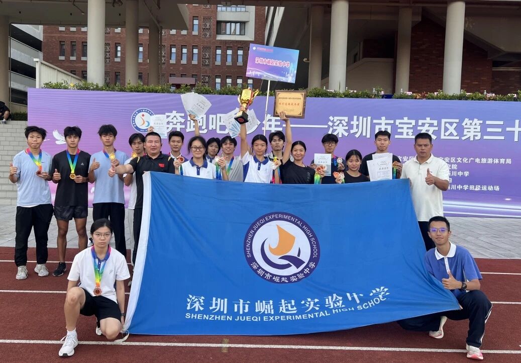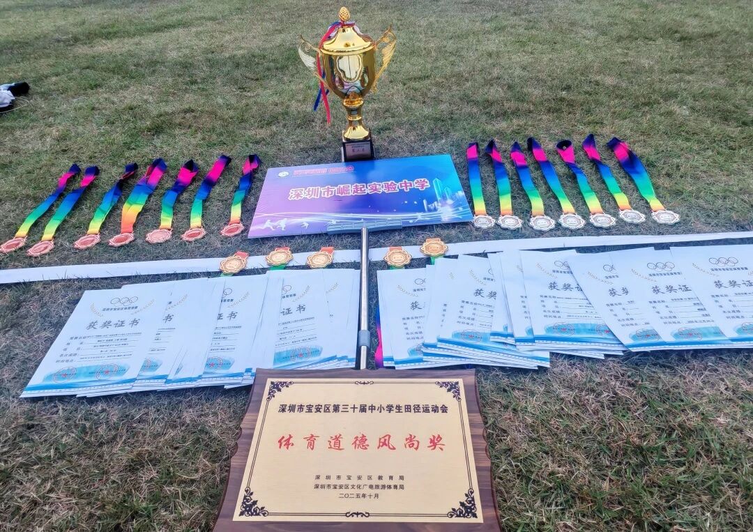 在10月26日下午結束的2025年深圳市寶安區第三十屆中小學田徑運動會中,崛起實驗中學田徑代表隊與來自全區22支田徑代表隊展開為期四天的激烈角逐,崛起學子表現突出,斬獲佳績,奪得高中/職校組團體總分亞軍。值得一提的是,本次比賽中,學校男子團體和女子團體分別榮獲總分第一名和第二名,在男子4x100米接力項目上再次刷新寶安區學生運動會高中組紀錄。同時斬獲3塊單項金牌,達國家一級運動員標準1人次。林志雄、謝海山、張福建三位老師被評為“優秀教練員”。學校榮獲“體育道德風尚獎”。